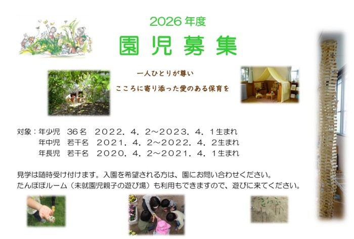 - 【明日(2/2)たんぽぽルームについて】 現在園内にて体調不良による欠席者が多数のため、2/2は、年中組は学級閉鎖となります。たんぽぽルームは、保育者不在でのオープンとなります。開放時間の変更はありませんが、「ふれあいあそび」「園庭開放」は中止といたします。体調がすぐれない場合は、無理せずお家でお過ごしください。よろしくお願いいたします。