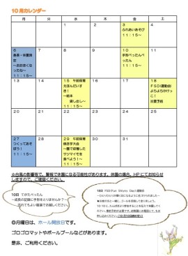 たんぽぽクラス 2025年10月~たんぽぽからのお知らせ~ 2025年9月29日(月) 『たんぽぽルーム』リニューアルのお知らせ 親子ひらば「たんぽぽ」は、更に幅広く利用していただける場となるよう、『たんぽぽルーム』としてリニューアルします。是非、遊びにきてください。 もどる